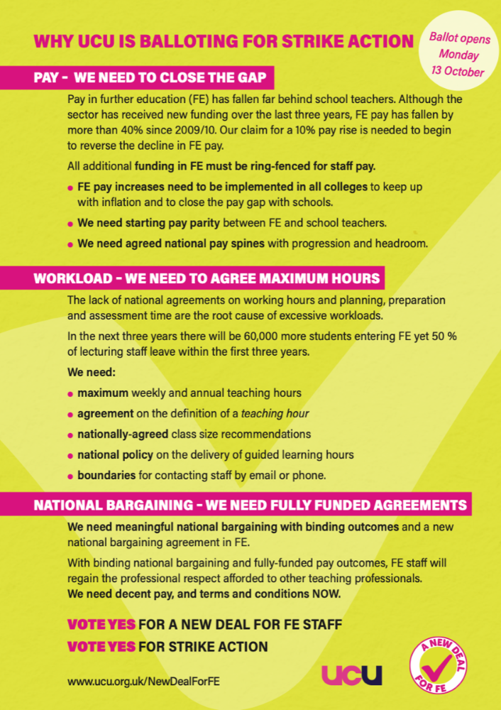 FE England staff deserve their pay to keep pace with inflation and pay parity with schoolteachers. Not only has pay fallen 35% in recent years, but over the last few years the sector has received additional funding from the UK government. That funding must go on staff pay. This dispute is about putting pressure on college employers, so the vast majority of FE funding is used to give you a decent pay rise, start to close the gap with schoolteachers pay, as well as pressing employers to engage meaningfully about workloads, and joining with us to work towards a new national settlement for FE.