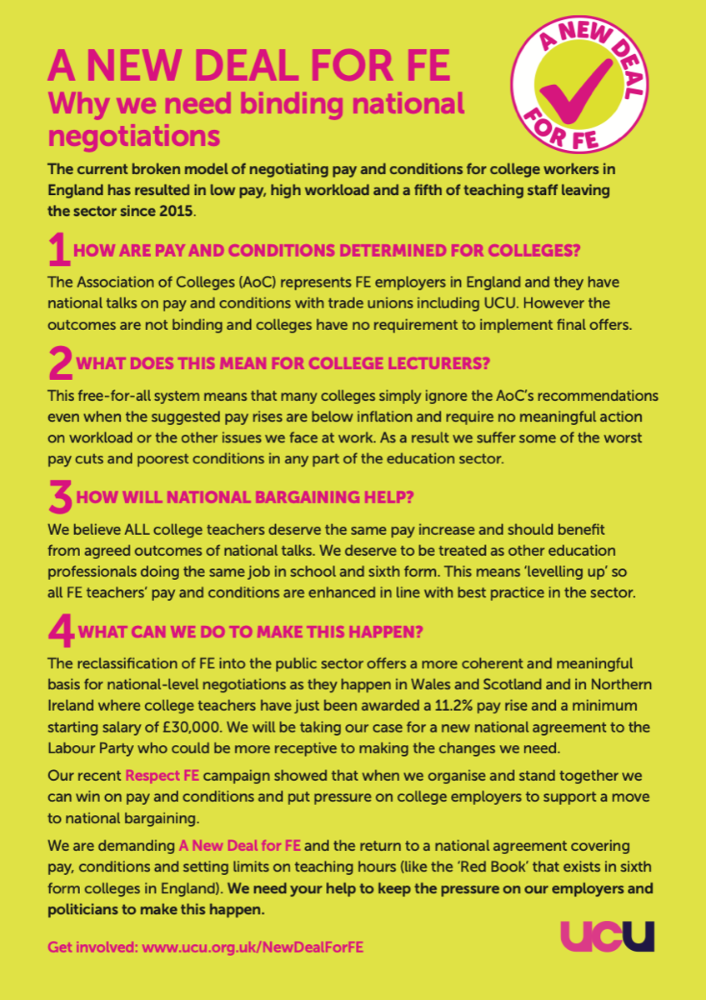 - National negotiations: the current system of non-binding recommendations from the AoC doesn't work and this is failing the sector, staff, and students. We need a New Deal for FE. Unlike other parts of the UK where teacher's pay and FE pay is linked, in England the outcomes of national talks are not binding or fully funded, and colleges have no requirement to implement any offer made. FE has been reclassified as part of the public sector. The current national bargaining agreement with non-binding outcomes is failing the sector. We need fully funded national pay bargaining with binding outcomes.
